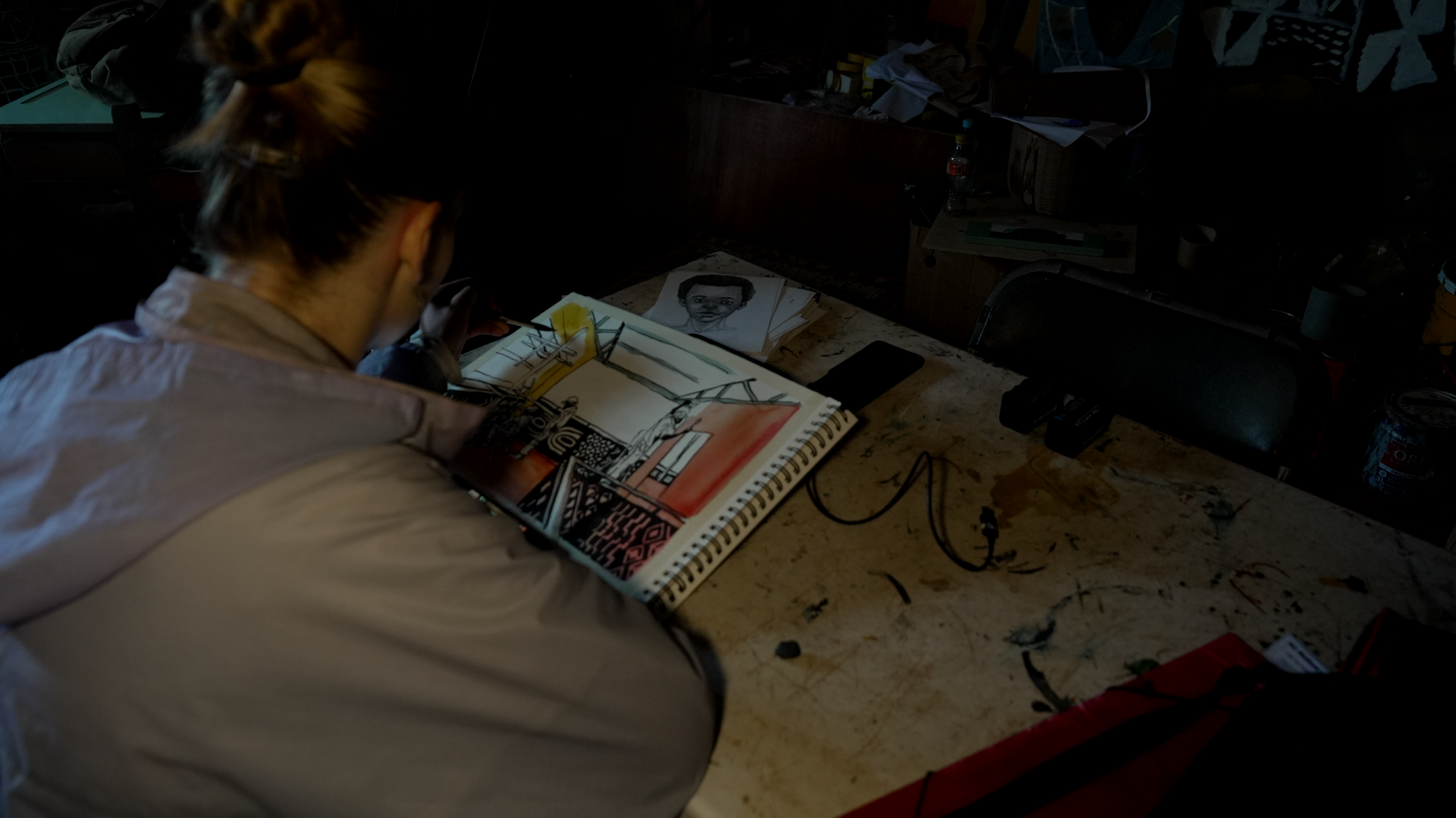 Nous avons rapidement pu accéder à une salle de classe de l'école inutilisée pour installer un atelier de dessin où nous pouvions accueillir des habitants pour des séances de portrait filmées.
