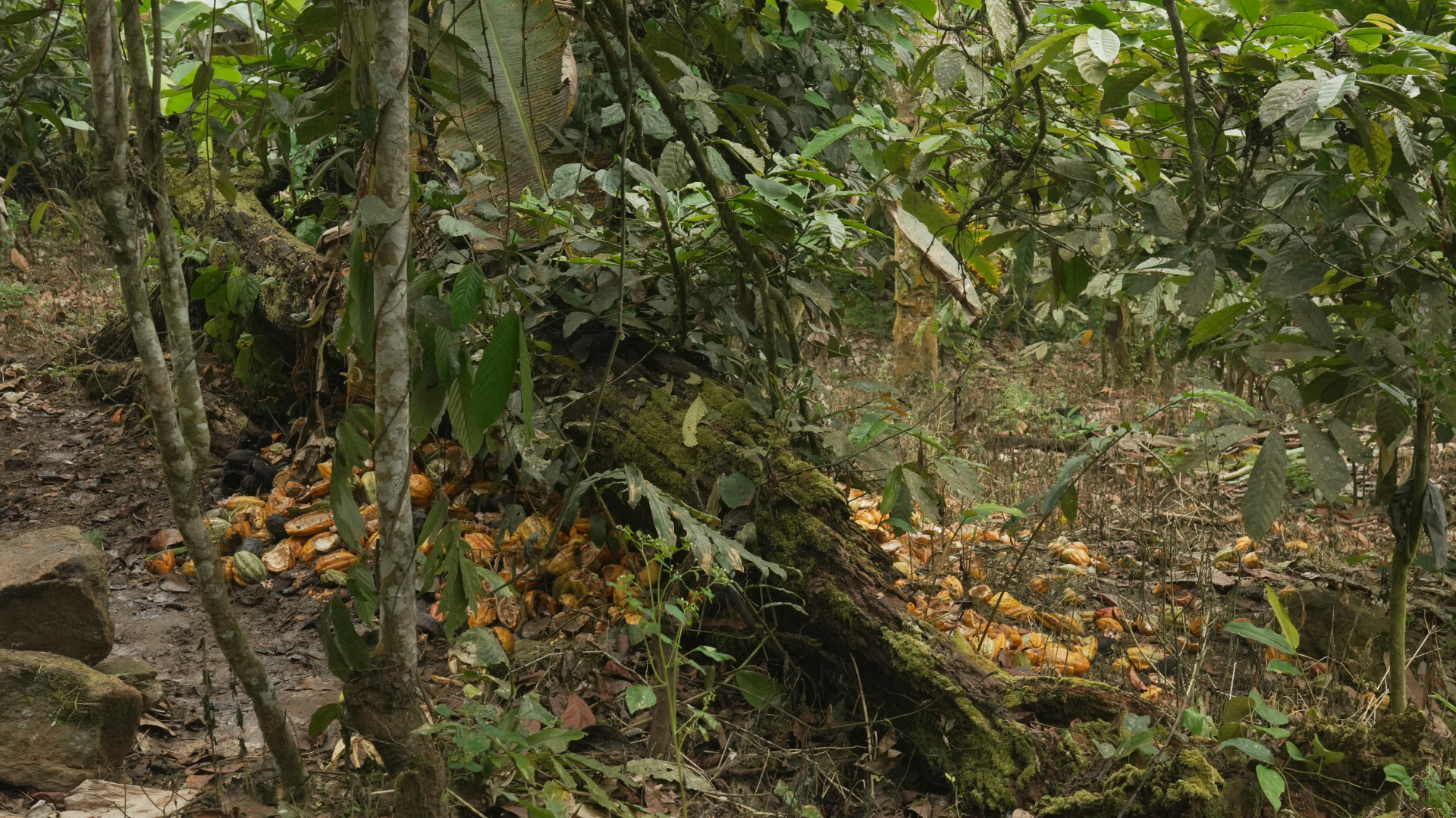 Mais environ toutes les 6 semaines, c'est le décabossage du cacao : il faut une grosse main d’œuvre pour évacuer rapidement les cabosses préalablement récoltées dans le champ de cacaoyers, afin qu'elles ne soient pas d'abord mangées par les animaux de la brousse.